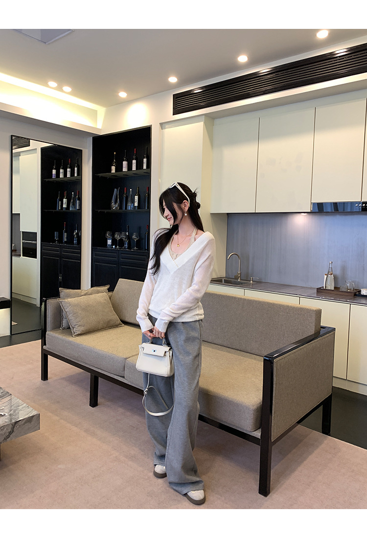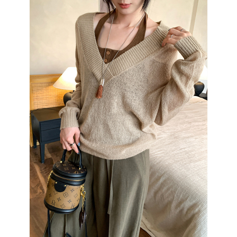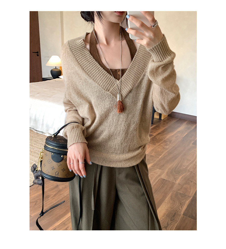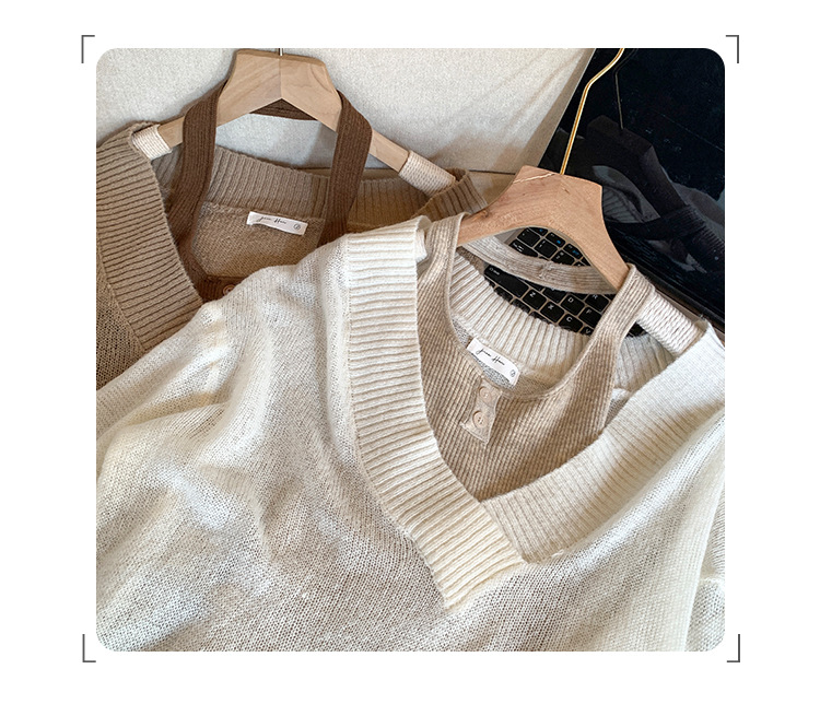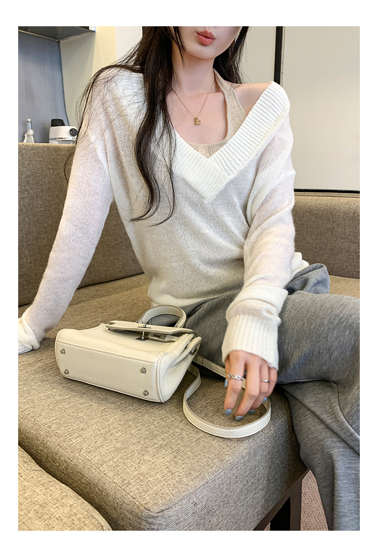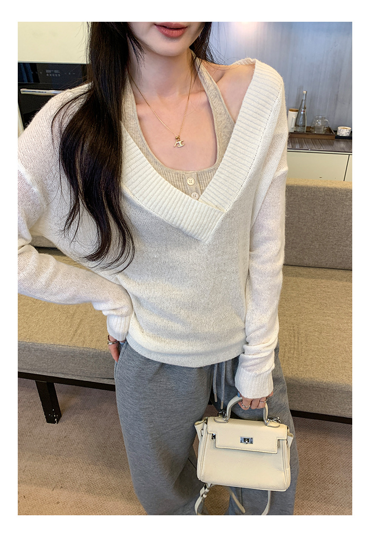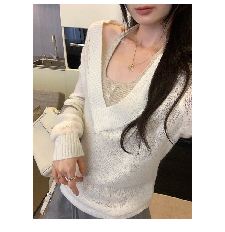 Faux Two-Piece Wool White V-Neck Knit Sweater for Women, Loose Bohemian Style Angora Top